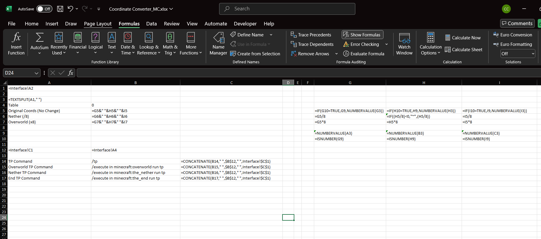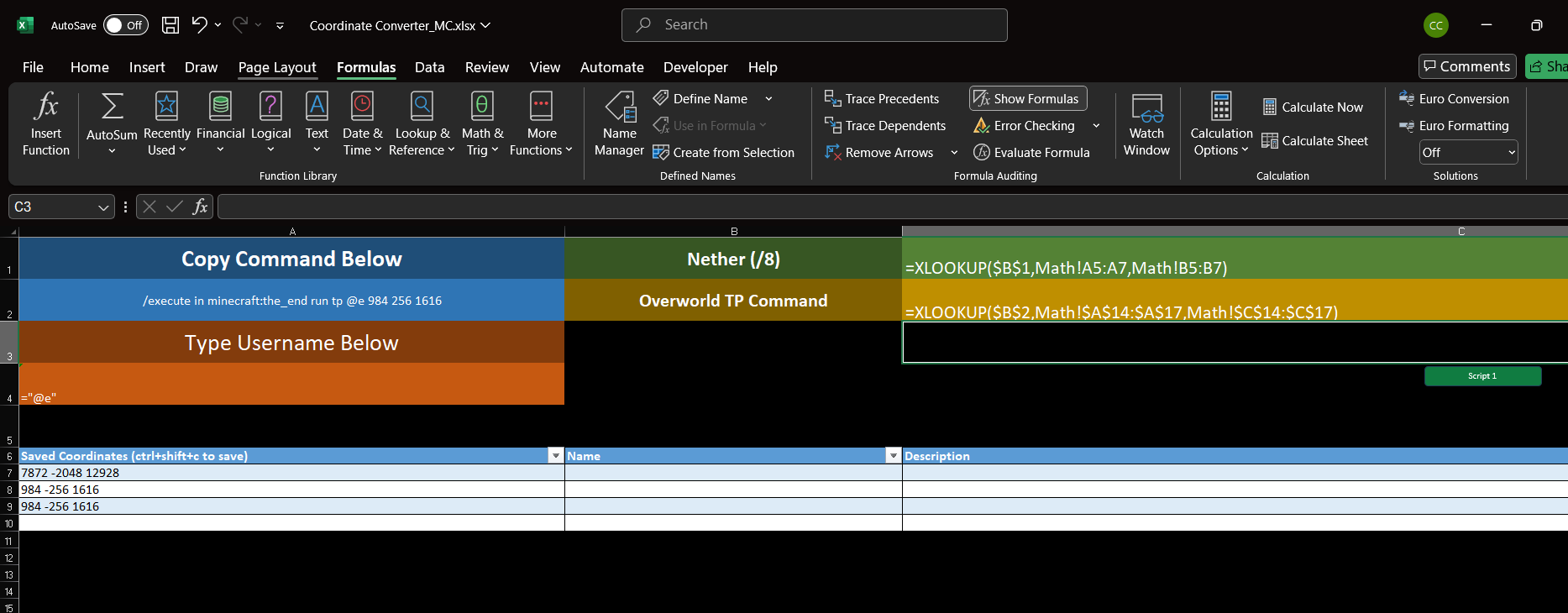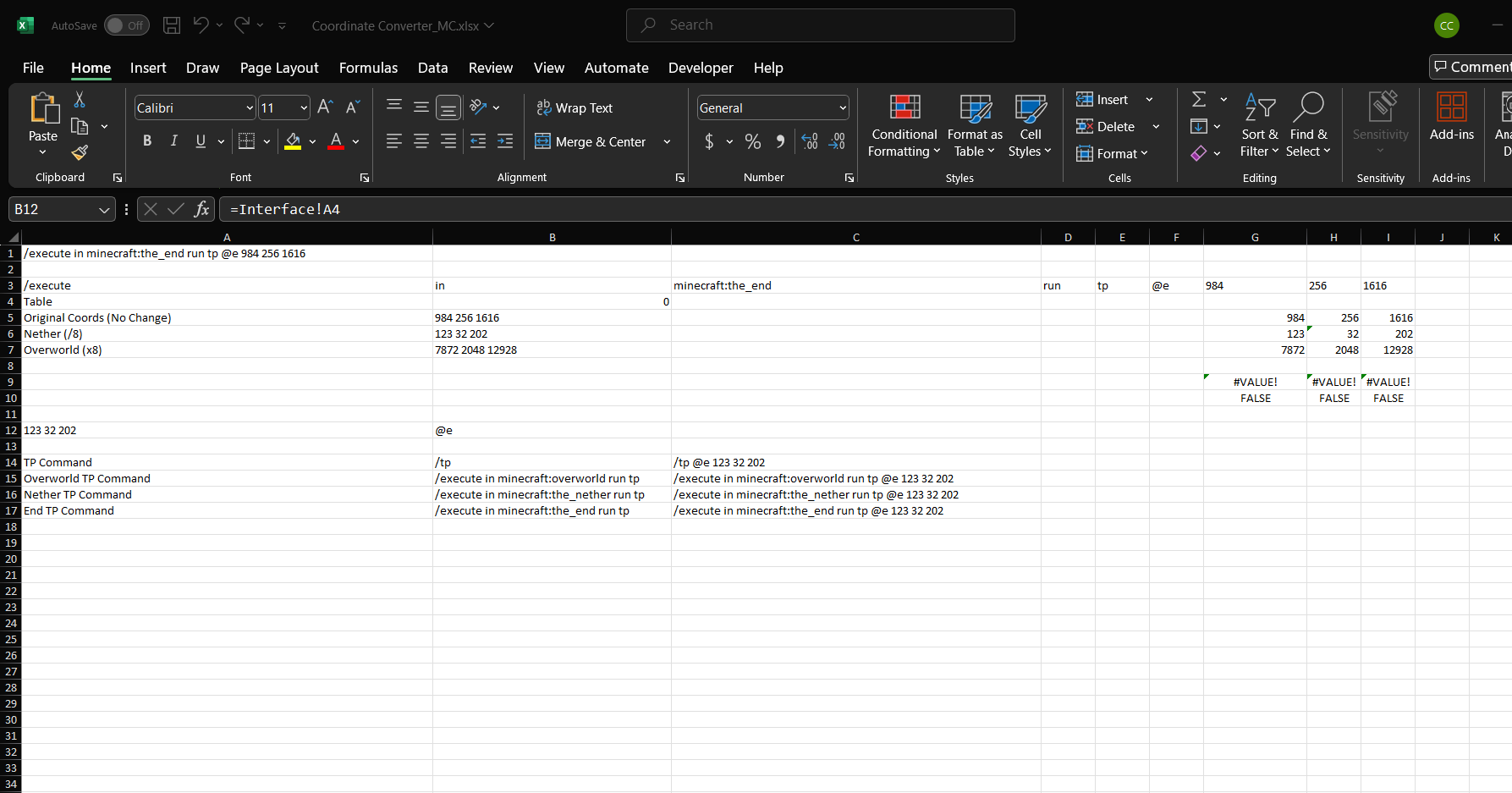 You can enter your coordinates (x y z), or you can enter the teleport command (/execute in minecraft:overworld run tp @e 123 32 202) you get when you use the keybind F3+C in Minecraft. Excel will automatically multiply, divide, or keep your coordinates the same, and provide you with a new teleport command to the Overworld, Nether, or End dimensions.